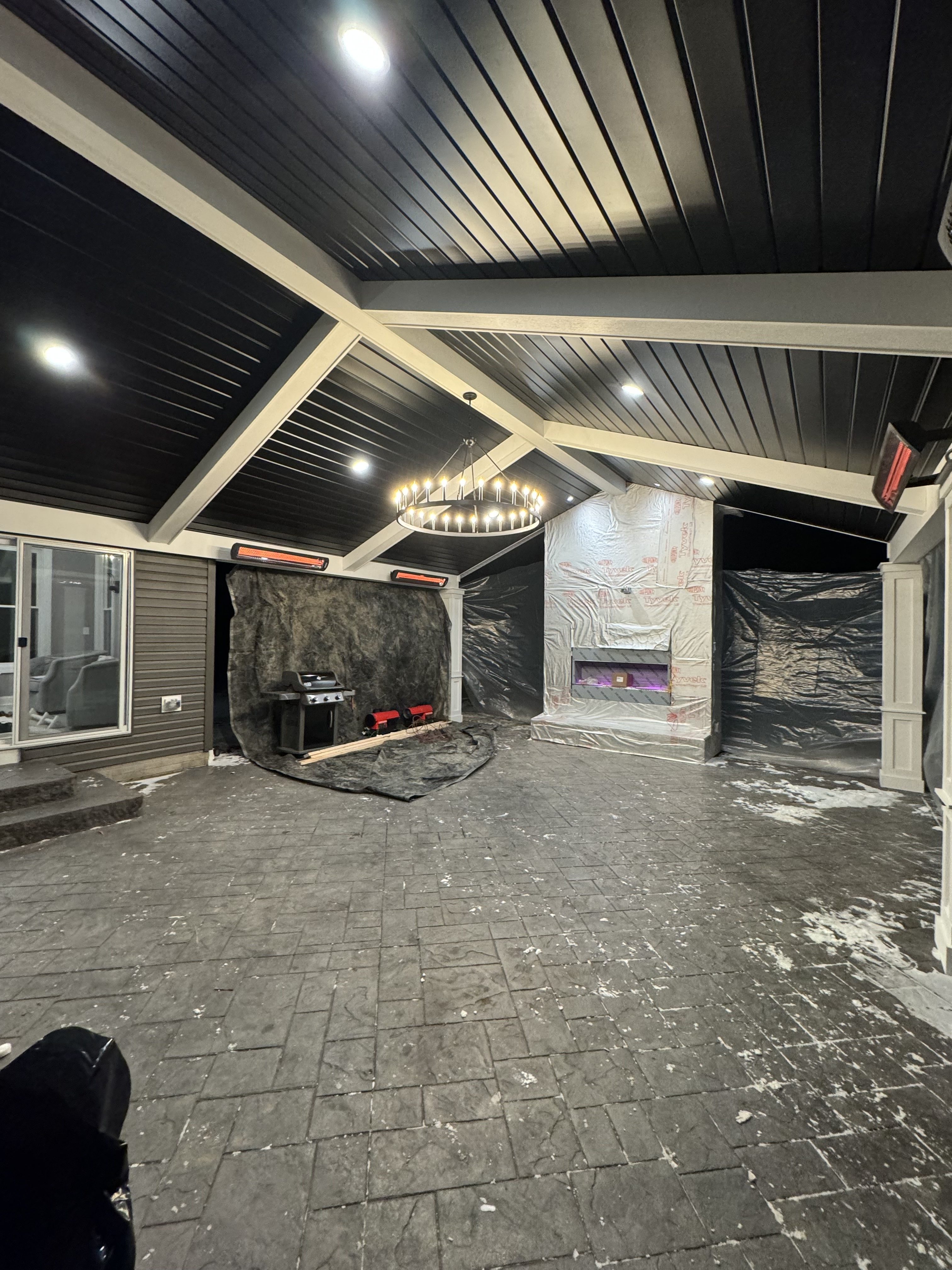 Our team of licensed electricians added 240v & 120v wiring for patio heaters, fireplace, receptacles, switches, wafer lights, and a chandelier for this beautiful, fully inspected, covered patio project on Vicky Drive in Brunswick, OH.
